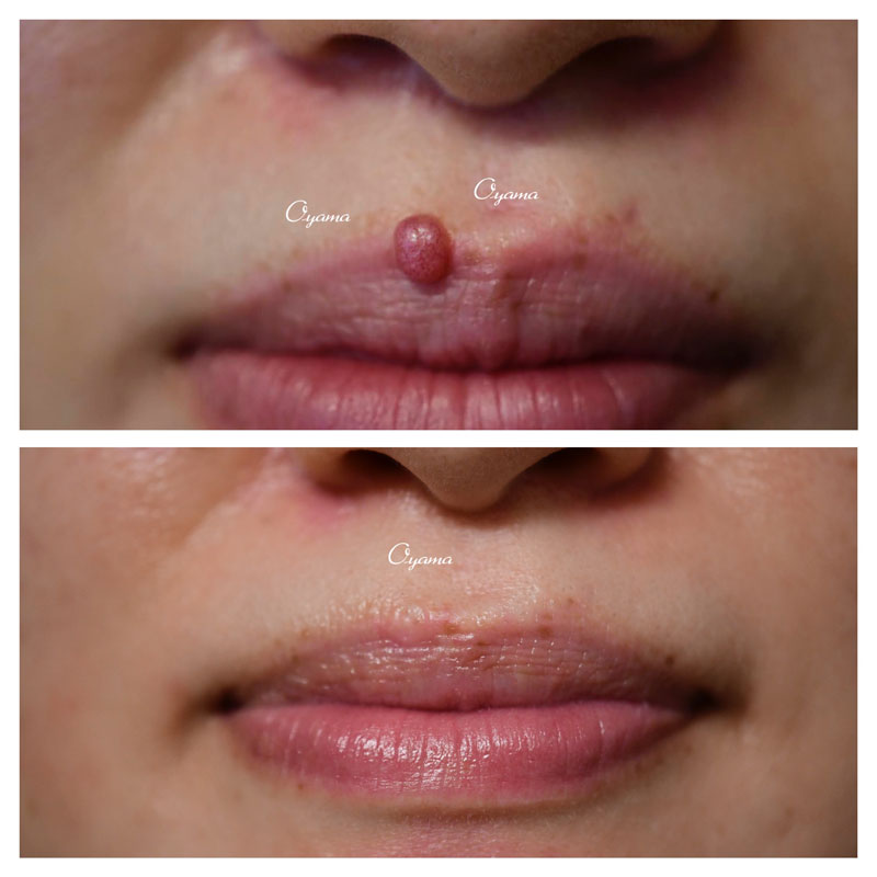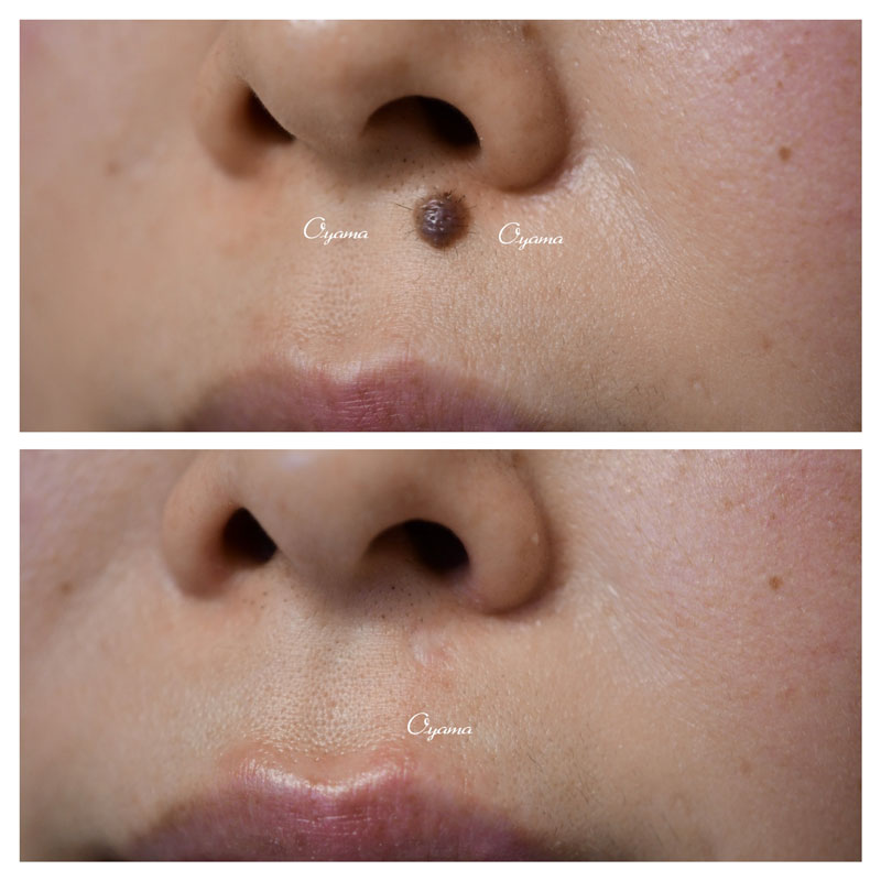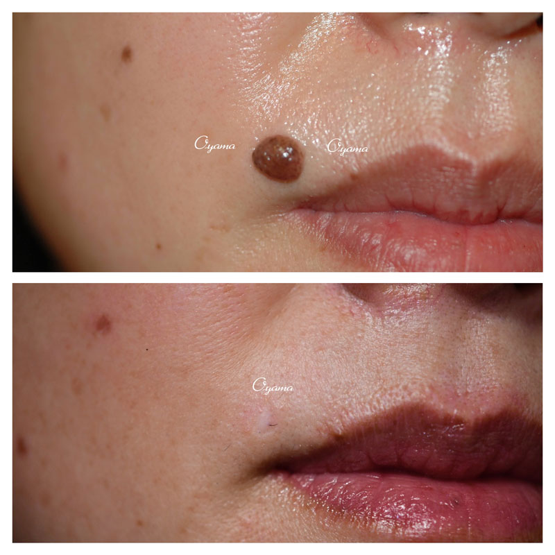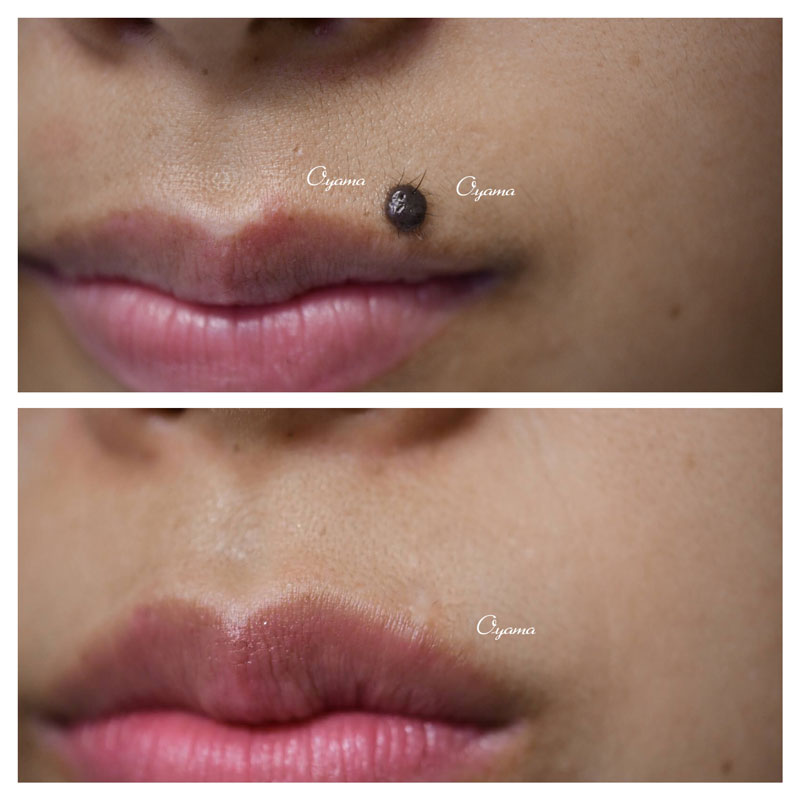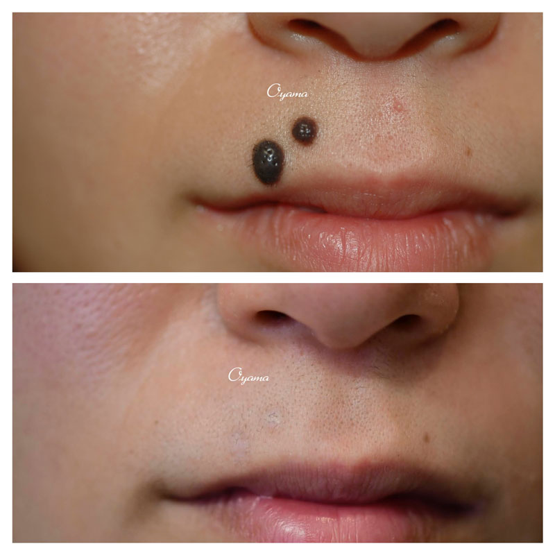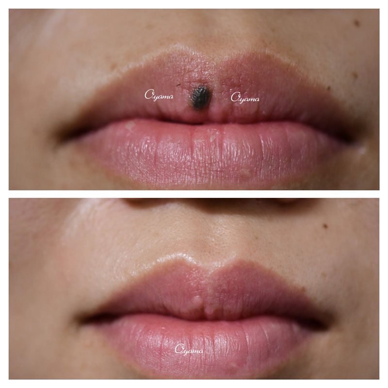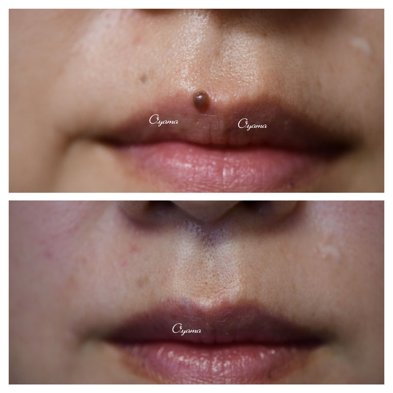 上唇にしっかりしたほくろが認められます。このような厚みがあるものは シミではありません。少し跡がありますが除去できています。
