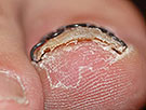 c )36歳、台東区の女性。つの字型に爪が皮フに入りこみ(1)、(2)とても痛がっていました。